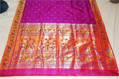 Peocock and paroot broked paithani saree created with the Falsa color and on the border peocock and paroot also created in pallu also like that design created.